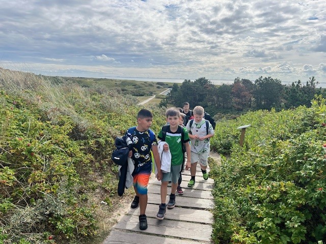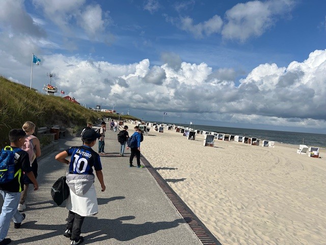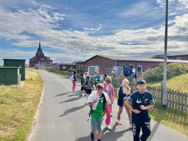 Am Mittwoch gab es zunächst Spiel und Spaß an der Unterkunft und auf der großzügigen Außensportanlage. Danach wanderten die drei Klassen gemeinsam am Strand entlang Richtung Inseldorf. Am Hauptstrand gab es dann ausreichend Zeit zum Spielen und Sandburgen bauen, bevor am Nachmittag alle gemeinsam das Meerwasseschwimmbad OASE besuchten. Die Hauptattraktionen des Schwimmbades: Rutsche, Whirlpool, Strudel sowie das Schwimmerbecken wurden ausgiebig genutzt. Nach der Rückkehr ins Gutenbergheim gab es nochmal ein wenig Freizeit sowie die tägliche „Stunde“ im Gruppenraum mit Ausfüllen des Klassenfahrtstagebuchs und des Beobachtungsheftchens „Der Strandläufer“ und Vorlesezeit zum Tagesausklang.