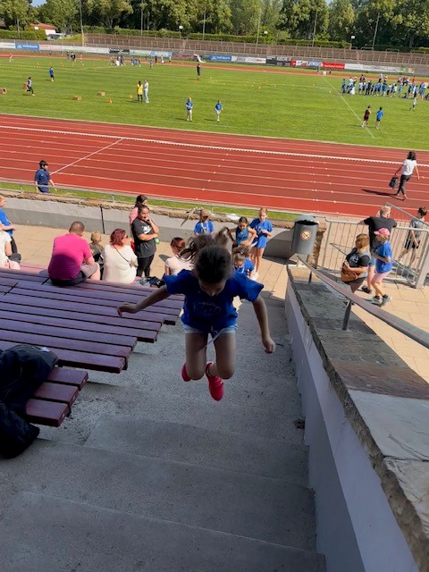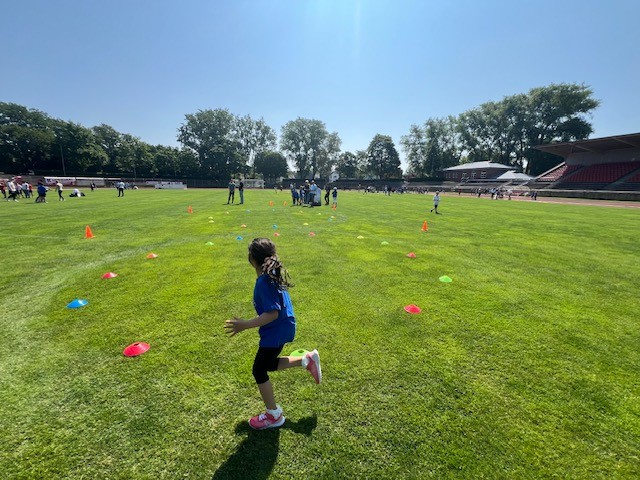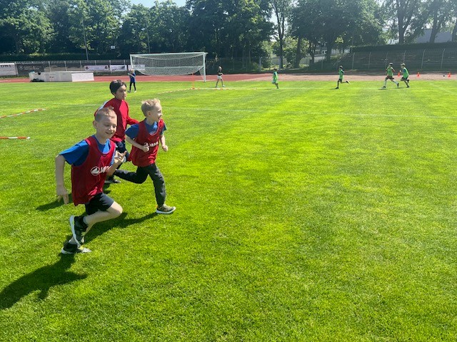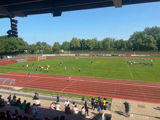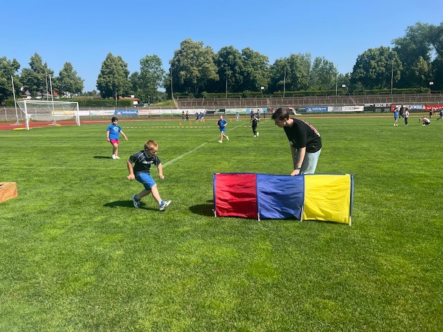 absolvieren. Der Spaß an der Bewegung stand im Vordergrund. Unterbrochen wurde das sportliche Treiben nur durch die Frühstückspause, die alle Kinder gemeinsam auf der schattigen Tribüne