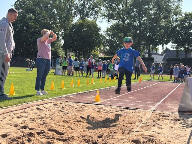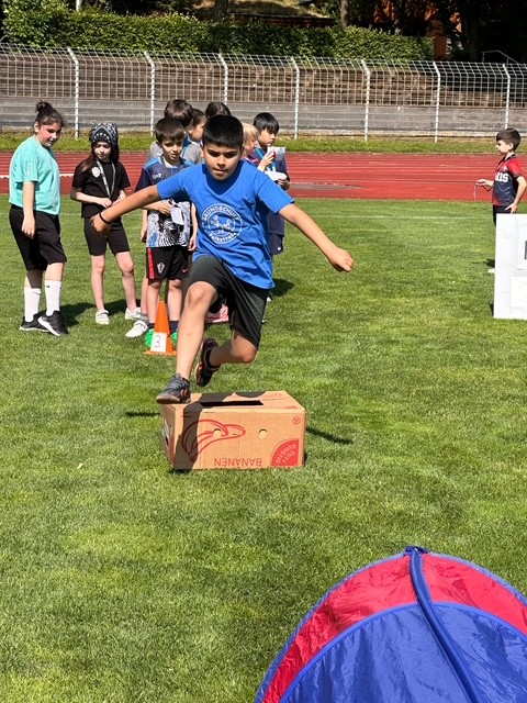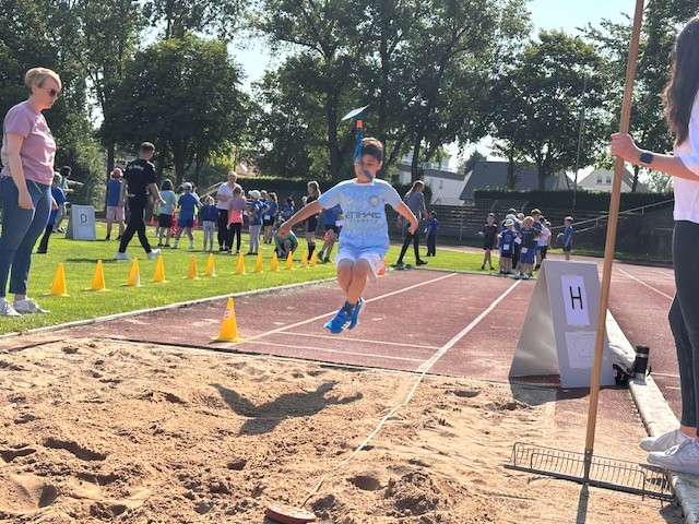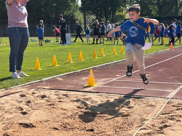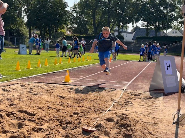Mit entsprechendem Elan starteten die Schülerinnen und Schüler nun mit dem sportlichen Wetteifern an 13 verschiedenen Stationen, die die Sportlehrkräfte unserer Schule zusammen mit vielen fleißigen Helferinnen und Helfern aus unserer Elternschaft aufgebaut hatten. An den Stationen wurde Bewegungsgeschick und -können aus einem breit gefächerten Angebot abgefragt, angelehnt an die richtigen olympischen Spiele. So konnten die Kinder ihr Können nicht nur in den Kerndisziplinen Laufen (Sprint/ Hindernislauf / Hürdenlauf), Springen (Zonenweitsprung/ Dreierhopp), und Werfen (Diskuswurf/ Hammerwurf/ Flatterballweitwurf/ Zielwurf) beweisen, sondern auch im Kugelstoßen, im Umgang mit Bällen (Torwandschießen, Korbwurf) und im Balancieren (Slackline).