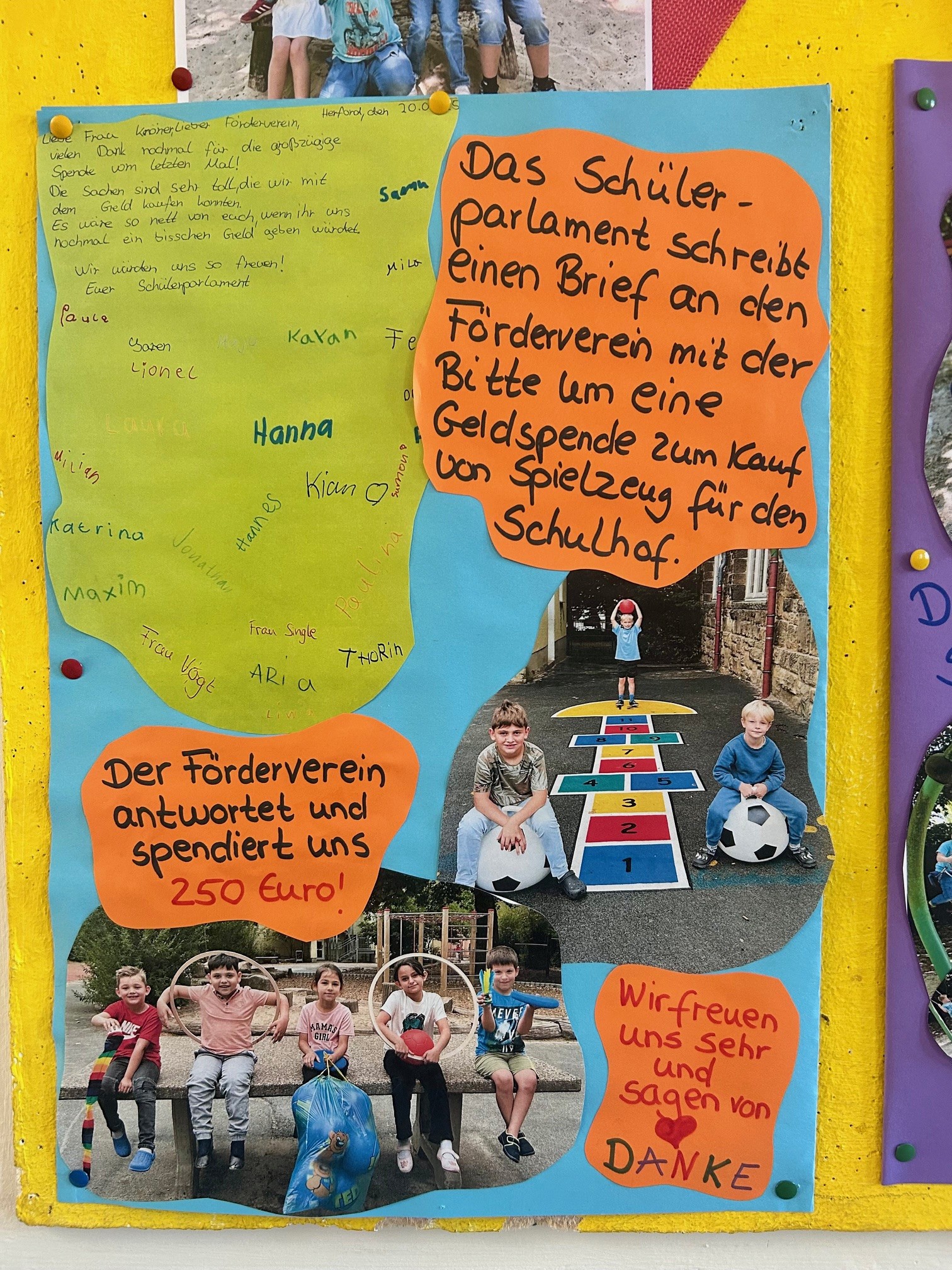 Das Schülerparlament hat einen Brief an den Förderverein mit der Bitte um eine Geldspende geschrieben.