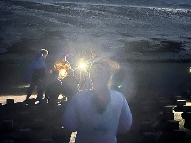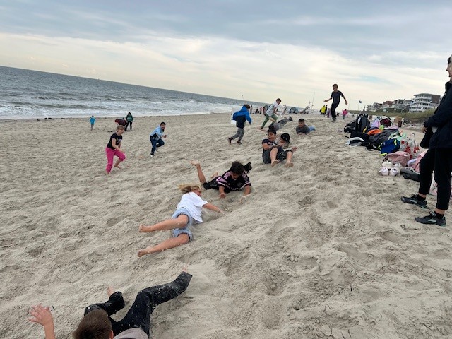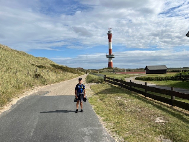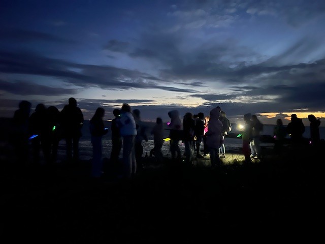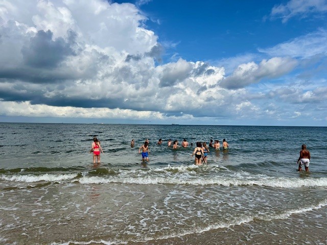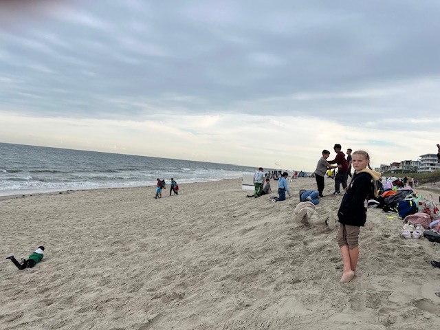 Am Donnerstag waren alle drei Klassen getrennt voneinander auf dem alten Leuchtturm mit seinem tollen Ausblick über die gesamte Insel und im Nationalparkhaus, welches eine sehr informative Ausstellung über das Wattenmer bietet. Besonders beeindruckend war, das ausgestellte Skelett eines Pottwales, der 2015 vor Wangerooge an Land gespült wurde. In der Mittagszeit trafen sich die drei Klassen an Wangerooges Hauptstrand und alle Kinder hatten die Gelegenheit unter der Aufsicht der Rettungsschwimmer Frau Wemhöner und Herr Taube in der Nordsee zu baden. Am späten Nachmittag wurden dann bereits die Koffer wieder gepackt, bevor es am Abend nach der obligatorischen Tagesreflexion zur Abschlussparty mit Musik auf den Deich ging. Mit Knicklichtern ausgestattet feierten die Kinder und Begleiter bei lauter Musik ausgelassen in die hereinbrechende dunkle Nacht hinein.