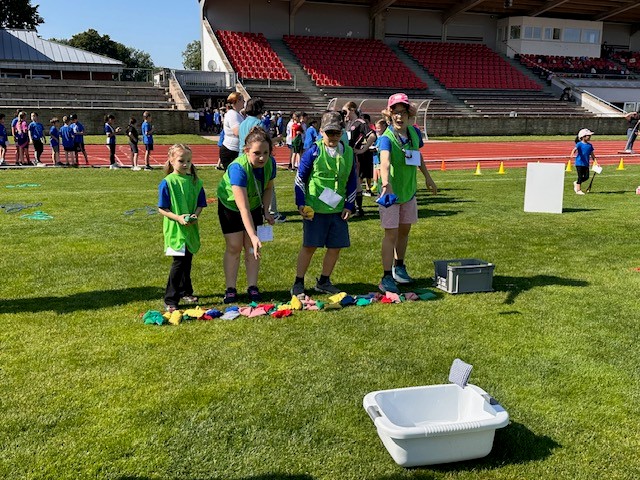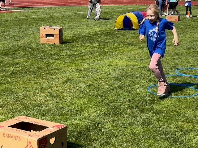 Bei tollem Wetter hatten die Kinder nun zwei gute Stunden Zeit, alle Stationen auszuprobieren. Wichtig dabei: Alle Kinder konnten die Stationen auf ihrem jeweiligen Niveau und in einer beliebigen Reihenfolge absolvieren. Der Spaß an der Bewegung stand im Vordergrund, getreu dem olympischen Motto: „Dabeisein ist alles!“. Unterbrochen wurde das sportliche Treiben nur durch die Frühstückspause, die alle Kinder gemeinsam auf der schattigen Tribüne verbrachten.