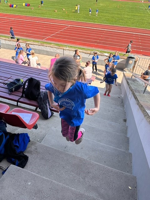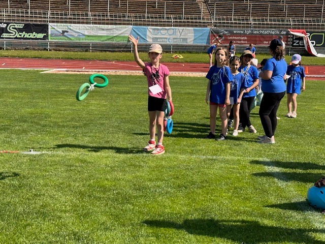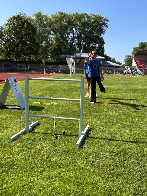 Zeit. Als Wurfdisziplinen wurde angeboten: Zwillingsringweitwurf, Kugelstoßen und Leitergolf. Ihre Sprungfertigkeiten konnten die Kinder beim Tribünehochhüpfen, beim Dreierhopp und beim
