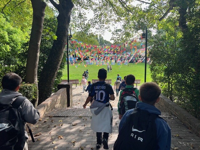 Von der Falkstraße aus zog die 4b in Richtung Hexenspielplatz und die 3a Richtung Aawiesenparkspielplatz weiter. Jede Klasse sammelte 2 Stunden sehr fleißig und motiviert jeglichen Müll ein, der ihr begegnete.