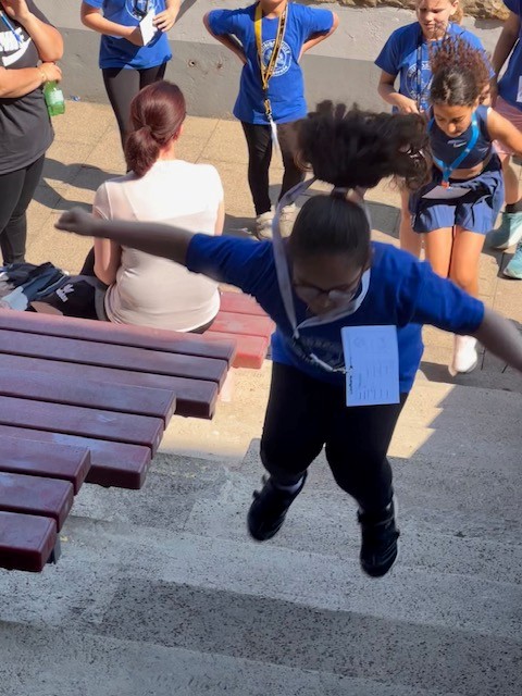 In einem anderen Workshop wurde u. a. der Gemeinschaftsgedanke spielerisch erfahrbar gemacht. Dafür wurde ein großes elastisches Tuch verwendet. Alle Kinder standen im Kreis und lehnten sich gegen das Tuch. Durch verschiedene Positionen und Bewegungen erfuhren die SuS, wie sich die Bewegung der anderen auf sie auswirkte und dass man von einer Gruppe getragen werden kann.